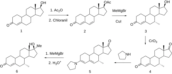 In the case at hand, heating acetate (1) with chloranil gives the conjugated dienone (2), and reaction of that compound with methylmagnesium bromide in the presence of cuprous chloride leads to addition of the methyl group to position 7 at the end of the conjugated system (3). The stereochemistry of the product again illustrates the preference for additions from the backside. The alcohol at C17 is then oxidized to a ketone (4). Enamines are commonly used to activate adjacent functions; they are also not infrequently used, as in this case, as protecting groups. Thus, reaction of the intermediate with pyrrolidine gives dienamine (5). This transformation emphasizes the clear difference in reactivity between ketones at C7 and C17. A second methyl Grignard addition gives the corresponding 17α-methyl derivative. Hydrolysis of the enamine function then affords mibolerone (6).