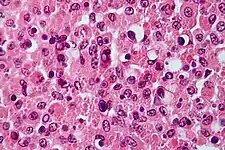 Micrograph showing Michaelis-Gutmann bodies. H&E stain.