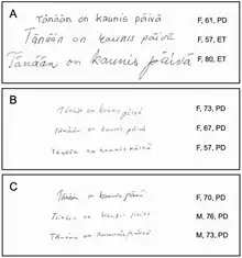 - ↑ Ziliotto A, Cersosimo MG, Micheli FE (2015). "Handwriting Rehabilitation in Parkinson Disease: A Pilot Study". Ann Rehabil Med. 39: 586–91. doi:10.5535/arm.2015.39.4.586. PMC 4564706. PMID 26361595.