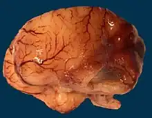 | Microlissencephaly in a 27 WG (week of gestation) foetus with TUBB2B mutation. Macroscopical view of the left hemisphere showing agyria, absent sylvian fissure and absent olfactory bulb. | |