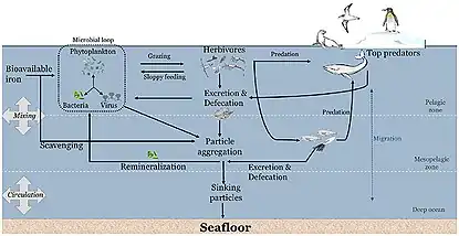 Micronutrient abundance in the environment greatly influences biogeochemical cycles at the microbial level which large ecological communities rely on to survive.[9] For example, marine primary producers are reliant upon bioavailable dissolved iron for photosynthesis.[10][11][12] Secondary and tertiary producers in oceans are therefore also reliant on the presence of sufficient dissolved iron concentrations.
