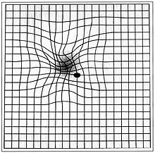 The Amsler grid test can be used to diagnose macular degeneration. For this test, patients are asked to look at a grid, and distortions or blank spots in the patient's central field of vision can be detected. A positive diagnosis of macular degeneration may account for a patient's micropsia.[6]