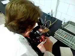 Optical or light microscopy involves passing visible light transmitted through or reflected from the sample through a single lens or multiple lenses to allow a magnified view of the sample.[11] The resulting image can be detected directly by the eye, imaged on a photographic plate, or captured digitally. The single lens with its attachments, or the system of lenses and imaging equipment, along with the appropriate lighting equipment, sample stage, and support, makes up the basic light microscope. The most recent development is the digital microscope, which uses a CCD camera to focus on the exhibit of interest. The image is shown on a computer screen, so eye-pieces are unnecessary.[12]