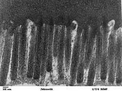 - ↑ Mukherjee T, Williams A (1967). "A comparative study of the ultrastructure of microvilli in the epithelium of small and large intestine of mice". J Cell Biol. 34 (2): 447–61. doi:10.1083/jcb.34.2.447. PMC 2107317. PMID 6035639. link Archived April 6, 2008, at the Wayback Machine