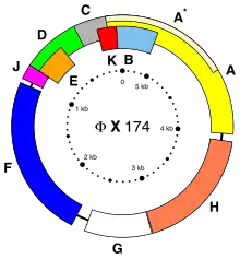 The genome sizes range from 4.5–6kb and is circular. It encodes 11 genes (in order: A, A*, B, C, K, D, E, J, F, G, and H), nine of which are essential. The nonessential genes are E and K.[8][9] Several of the genes have overlapping reading frames.[10][11] Protein A* is encoded within protein A. It lacks ~1/3 of the amino acids from the N terminal of the A protein and is encoded in the same frame as the A protein. It is translated from an internal start site within the messenger RNA. Gene E is encoded with gene D with a +1 frameshift. Gene K overlaps genes A, B, and C. The origin of replication lies within a 30 base sequence.[12] The entire 30 base sequence is required for replication.[13]