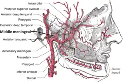 The middle meningeal artery may arise not only from the maxillary artery but also from the ophthalmic artery, or lacrimal artery.[1]