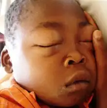 Minimal change disease (MCD), also known as lipoid nephrosis or nil disease, among others, is a disease affecting the kidneys which causes nephrotic syndrome.[1] Nephrotic syndrome leads to the loss of significant amounts of protein to the urine (proteinuria), which causes the widespread edema (soft tissue swelling) and impaired kidney function commonly experienced by those affected by the disease.[1] It is most common in children and has a peak incidence at 2 to 6 years of age.[2] MCD is responsible for 10–25% of nephrotic syndrome cases in adults.[3] It is also the most common cause of nephrotic syndrome of unclear cause (idiopathic) in children.[3]