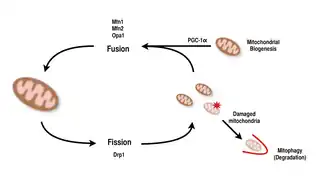 Mitochondria are highly versatile and are able to change their shape through fission and fusion events.[9][8] Definitively, fission is the event of a single entity breaking apart, whereas fusion is the event of two or more entities joining to form a whole.[8] The processes of fission and fusion oppose each other and allow the mitochondrial network to constantly remodel itself.[9][8] If a stimulus induces a change in the balance of fission and fusion in a cell, it could significantly alter the mitochondrial network.[9][13] For example, an increase in mitochondrial fission would create many fragmented mitochondria, which has been shown to be useful for eliminating damaged mitochondria and for creating smaller mitochondria for efficient transporting to energy-demanding areas.[13][14] Therefore, achieving a balance between these mechanisms allows a cell to have the proper organization of its mitochondrial network during biogenesis and may have an important role in muscle adaptation to physiological stress.[13]