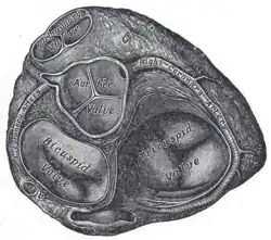 ![]() Base of ventricles exposed by removal of the atria. (Bicuspid (mitral) valve visible at bottom left.