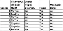 - 1 2 3 4 Shalabi, M; Whitley, RJ (Nov 1, 2006). "Recurrent benign lymphocytic meningitis". Clinical Infectious Diseases. 43 (9): 1194–7. doi:10.1086/508281. PMID 17029141.