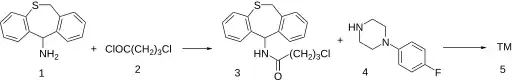 The amino group of the dihydrodibenzothiepin (1) is first reacted with the acid chloride of 4-chlorobutyric acid, to give the amide (3). This is then used to alkylate para-fluorophenylpiperazine (4) to yield monatepil.[2][3]