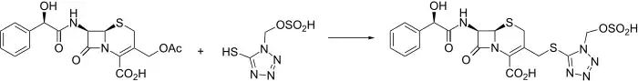 Cefonicid is synthesized conveniently by nucleophilic displacement of the 3-acetoxy moiety of 1 with the appropriately substituted tetrazole thiole 2. The mandelic acid amide C-7 side chain is reminiscent of cefamandole.