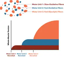 Motor unit recruitment is the activation of additional motor units to accomplish an increase in contractile strength in a muscle.[1] A motor unit consists of one motor neuron and all of the muscle fibers it stimulates. All muscles consist of a number of motor units and the fibers belonging to a motor unit are dispersed and intermingle amongst fibers of other units. The muscle fibers belonging to one motor unit can be spread throughout part, or most of the entire muscle, depending on the number of fibers and size of the muscle.[2][3] When a motor neuron is activated, all of the muscle fibers innervated by the motor neuron are stimulated and contract. The activation of one motor neuron will result in a weak but distributed muscle contraction. The activation of more motor neurons will result in more muscle fibers being activated, and therefore a stronger muscle contraction. Motor unit recruitment is a measure of how many motor neurons are activated in a particular muscle, and therefore is a measure of how many muscle fibers of that muscle are activated. The higher the recruitment the stronger the muscle contraction will be. Motor units are generally recruited in order of smallest to largest (smallest motor neurons to largest motor neurons, and thus slow to fast twitch) as contraction increases. This is known as Henneman's size principle.[4]