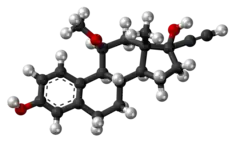Moxestrol, also known as 11β-methoxy-17α-ethynylestradiol (11β-MeO-EE) or as 11β-methoxy-17α-ethynylestra-1,3,5(10)-triene-3,17β-diol, is a synthetic estrane steroid and a derivative of estradiol.[3] It is specifically a derivative of ethinylestradiol (17α-ethynylestradiol) with a methoxy group at the C11β position and a derivative of 11β-methoxyestradiol with an ethynyl group at the C17α position.[3] The compound is the C11β isomer or C11 epimer of RU-16117 (11α-methoxy-17α-ethynylestradiol.[13]