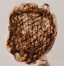 Moyeria is a genus of fossils initially considered acritarchs, of unknown evolutionary affinity. They were widely interpreted as resting cysts of marine algae. Its vesicle wall has a distinct ultrastructure that resembles the pellicle of euglenids, which is composed of proteinaceous strips. For this reason, during the 20th century some authors proposed Moyeria as part of the Euglenida.[1] After examinations through transmission electron microscopy, the stripes in the wall of these microfossils were revealed to correspond to the pellicle strips of modern euglenids, and Moyeria was formally transferred to the Euglenida in 2019.[2]