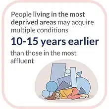 Research shows that in Scotland residents of deprived areas are affected by multiple long-term conditions 10 to 15 years earlier than people living in affluent neighborhoods. They also have a higher chance that their long-term conditions include mental health disorders.[72] In England, according to research, people from deprived neighborhoods had complex multimorbidity (3 or more conditions) 7 years earlier than the least deprived.[73] People living in deprived areas also have a higher risk of dying because of multimorbidity.[74]