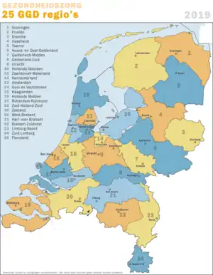 In the European Netherlands, a Municipal Health Service (Dutch: Gemeentelijke Gezondheidsdienst, GGD) is a decentralised public health organisation. Legally, the responsibility for the provision of this service lies with the municipalities.[1] However, in practice, the municipalities work together to provide this service at a regional level, resulting in twenty-five "GGD regions".[1] The borders of the GGD regions largely correspond to the borders of the safety regions.