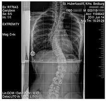 Scoliosis, is a medical condition where a person's spine has several irregular curves that are located between the neck and the pelvis.[8] Symptoms of scoliosis in mild cases usually exhibit abnormal posture, back pain, tingling or numbness in the legs and in worse cases can exhibit breathing problems, fatigue, permanent deformities and in rare cases heart problems.[8]