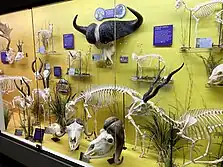 The museum offers many exhibits from all five vertebrate classes. There are also floating exhibits throughout the museum and whales hanging from the ceiling.[17] All the specimens on display are cleaned at the Skulls Unlimited building next door, using dermestid beetles[18] before being articulated and then put on display.[19] The exhibits display a wide range of topics, including locomotion, adaptation, and forensic osteology and pathology.[9][20] The museum also offers scavenger hunts and activities aimed at children and parents.[9]