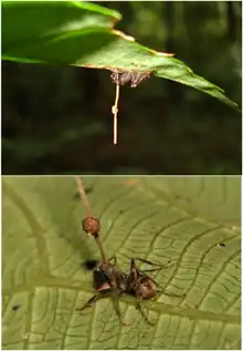 A prominent example of an entomopathogenic fungus is Ophiocordyceps unilateralis, nicknamed the “zombie-ant” fungus. The fungus infects ants and alters their natural behavioral patterns causing the ant to leave their usual environment in the trees in favor of the forest floor – a more suitable environment for fungal growth. The insects will then attach themselves to the underside of a leaf until it dies. Fungal spores then sprout out of the dead ant's head and are dispersed.[23][24]