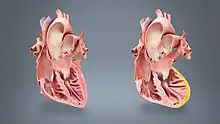 Myocardial rupture is most common three to seven days after myocardial infarction, commonly of small degree, but may occur one day to three weeks later. In the modern era of early revascularization and intensive pharmacotherapy as treatment for MI, the incidence of myocardial rupture is about 1% of all MIs.[6] This may occur in the free walls of the ventricles, the septum between them, the papillary muscles, or less commonly the atria. Rupture occurs because of increased pressure against the weakened walls of the heart chambers due to heart muscle that cannot pump blood out effectively. The weakness may also lead to ventricular aneurysm, a localized dilation or ballooning of the heart chamber.