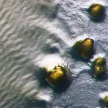 M. xanthus appear as gram-negative rods without flagella.[4] These rods have an average length of 7 microns and width of 0.5 microns.[5] It utilizes type IV pilus (T4P) to move in a "gliding" manner, crawling along a surface.[6] As a colony or swarm, M. xanthus appear as a thin layer of ripples, often moving toward prey. In its spore form, the bacterium becomes a sphere with a thick outer membrane. This spore is yellow-orange, giving M. xanthus its name (xanthós, Ancient Greek meaning "golden"). [4]