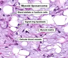 | Histopathologic image of myxoid liposarcoma arising in the thigh. H & E stain. | |