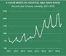 - ↑ "12-hour patient waits in A&E increase by 10,000% in five years". Healthcare Leader. 25 September 2017. Retrieved 22 December 2017.