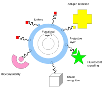 Nanotechnology-on-a-chip is one more dimension of lab-on-a-chip technology. Magnetic nanoparticles, bound to a suitable antibody, are used to label specific molecules, structures or microorganisms. Silica nanoparticles, in particular, are inert from a photophysical perspective and can accumulate a large number of dye(s) within their shells.[42] Gold nanoparticles tagged with short DNA segments can be used to detect genetic sequences in a sample. Multicolor optical coding for biological assays has been achieved by embedding different-sized quantum dots into polymeric microbeads. Nanopore technology for analysis of nucleic acids converts strings of nucleotides directly into electronic signatures.[43]