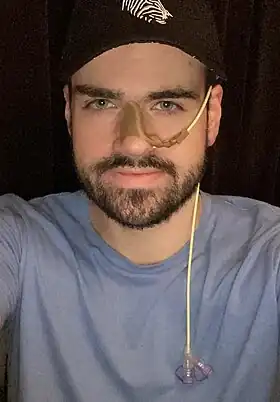 ![]() A man with a nasogastric feeding tube through which feed and medicine can be delivered to the stomach using either a pump or gravity |