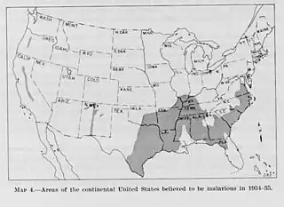 Malaria was originally only endemic in the Old World. Plasmodium vivax was imported to North America by British settlers, and Plasmodium falciparum arrived in the bodies of enslaved Africans.[2] The expansion of agriculture in the North often involved clearing forests and draining swamps, reducing the breeding area for mosquitoes. The opposite happened in parts of the South, as the breeding area increased where rice was grown.[3]