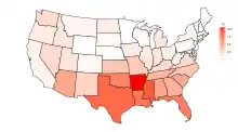 The 1890 US census reported 880 thousand deaths, of which 2.1 percent were due to malaria. This percentage ranged from 0.2 percent in Minnesota and Wyoming to 10.6 percent in Arkansas; see the accompanying figure.[4]