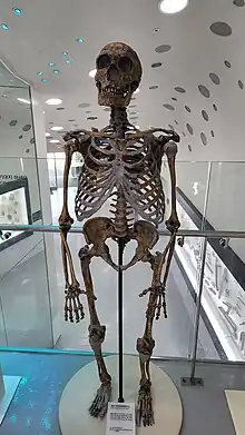 In a sample of 45 Neanderthal long bones from 14 men and 7 women, the average height was 164 to 168 cm (5 ft 5 in to 5 ft 6 in) for males and 152 to 156 cm (5 ft 0 in to 5 ft 1 in) for females.[35] The fossil record shows that adult Neanderthals varied from about 147.5 to 177 cm (4 ft 10 in to 5 ft 10 in) in height.[36]