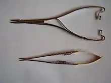 Most needle holders are designed to be gripped with the fingers and palm like scissors. However, some are designed for a tweezers-like grip to allow finer, more precise movements around delicate structures or narrow spaces. An example of such is the Castroviejo needle holder (named after Spanish American eye surgeon Ramón Castroviejo), which is commonly used in eye surgery, microsurgery and dental surgery.
