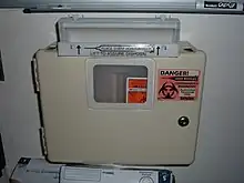 There are several electrically powered needle-removers on the market now. The Disintegrator Needle Destruction Device, offered by American Scientific Resources (ASFX), uses plasma arc technology to destroy the needle, kill pathogens and blunt the syringe. Designed to be used with only one hand, this device completely eliminates the sharp. One model from Techno Fab uses a regular electrical short-circuit to melt the needle, while another needle-remover, seen at CarePathways.com, uses a plasma arc to melt the needle.[23][24] A unique needle-remover design is the Needle Remover Device, designed by the Program for Appropriate Technology in Health (PATH). It uses two handles that are squeezed together to slide two circular blades across each other, which cuts the hub from the syringe. It is also reusable, and its target cost is about $15.[3] Another needle-removers currently on the market is Advanced Care Products's Clip&Stor, which uses a hand-powered clipper action to remove the needle.[25] The cost of the Clip&Stor is about seven dollars. There is also the BD Hub Cutter, which uses a squeezing hand motion to cut the syringe. The edges of the squeezable parts have blades that do the actual cutting. However, unlike a regular needle-remover, the BD Hub Cutter cuts the syringe at the hub so the needle is completely separated from the syringe. As a result, the risk of a contaminated puncture is completely eliminated because no needle shards remain on the syringe. The Hub Cutter is not reusable though, and disposal of the whole unit must occur.[26] The cost of the Hub Cutter is about four dollars.[1]