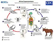 African trypanosomiasis (African sleeping sickness) is a somewhat rare protozoal disease, with fewer than 10,000 cases currently.[53] Human African trypanosomiasis is vector-borne and spreads through the bite of the tsetse fly.[39] The most common symptoms are fever, headache, lymphadenopathy, sleeping disturbances, personality changes, cognitive decline, and coma. The disease is always fatal if untreated. The current forms of treatment are highly toxic and ineffective, as resistance is spreading. It is diagnosed through an inexpensive serological test.
