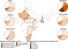Mycetoma is an infection under the skin which in India may have either a fungus or a bacterium as cause.[42] In Rajasthan the cause is usually a fungus, but elsewhere in India a bacterium usually causes the disease.[42]