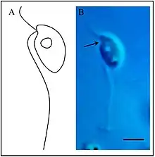 | Neobodo designis (A) Schematic drawing; (B) Photo, where the arrow indicates the apical flagellar pocket. Scale of 5 µm | |