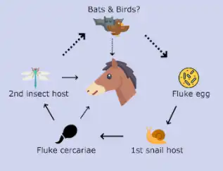 It is proposed that horses can be exposed to N. risticii through two routes. Horses can be exposed through skin penetration by infected cercaria form of the fluke. This is commonly seen when horses are grazing near contaminated water sources.[16] Another route of exposure is through directly ingesting the second intermediate host, aquatic insects, containing the infected metacercariae.[14]