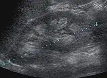 Nephrocalcinosis, once known as Albright's calcinosis after Fuller Albright, is a term originally used to describe the deposition of poorly soluble calcium salts in the renal parenchyma due to hyperparathyroidism. The term nephrocalcinosis is used to describe the deposition of both calcium oxalate and calcium phosphate.[1] It may cause acute kidney injury. It is now more commonly used to describe diffuse, fine, renal parenchymal calcification in radiology.[2] It is caused by multiple different conditions and is determined by progressive kidney dysfunction. These outlines eventually come together to form a dense mass.[3] During its early stages, nephrocalcinosis is visible on x-ray, and appears as a fine granular mottling over the renal outlines. It is most commonly seen as an incidental finding with medullary sponge kidney on an abdominal x-ray. It may be severe enough to cause (as well as be caused by) renal tubular acidosis or even end stage kidney disease, due to disruption of the kidney tissue by the deposited calcium salts.