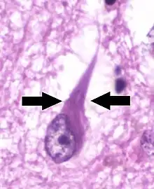 Microscopy of a cell with neurofibrillary tangles (marked by arrows)