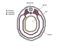 The mesoderm of a vertebrate embryo in the neurula stage can be divided into five regions. Ventral to the neural tube is the chordamesoderm. Lateral to either side of the neural tube is the paraxial mesoderm, while the intermediate lateral region to the neural tube is the intermediate mesoderm. The fourth region is the lateral plate mesoderm, and the last region is the head mesenchym.[5] Anterior portions of the mesoderm develop into rostral regions of an organism, such as the head, while posterior mesoderm develops into caudal regions, such as the trunk or tail.[1] The paraxial mesoderm, also termed somitic mesoderm, develops into somites, blocks of tissue that occur in a segmental pattern. Somites, in turn, give rise to vertebrae, ribs, skeletal muscle, cartilage, tendons, and skin.[8][11]
