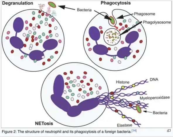 In figure 2, it shows the main three ways in which a neutrophil can approach attacking and getting rid of a foreign antigen or bacteria. The top left illustrates degranulation, a process in which the neutrophil itself degradulates and then releases its substances in the outer circulation in which the bacteria lies. These contents work to destroy/break down the bacteria. The second way, on the upper right, shows phagocytosis. This is when the bacteria is brought into the neutrophil by the plasma membrane engulfing it and pulling it inside to create a vacuole. The engulfing process begins with a bacteria, then turns into a phagosome when it being to form a vacuole, and lastly becomes a phagolysosome that contain broken down bacteria with contents from the neutrophil environment inside. These contents have enzymes that degrade the bacteria coupled with a low pH of the internal environment. Lastly, in the bottom part of the image, it shows NETosis. Comparatively to the other bacteria, the bacteria are much larger and thus need this process to be combatted. It includes the creation of NETs or neutrophil extracellular traps that are composed of DNA wrapped around histones and proteins like myeloperoxidase and elastase. These DNA string extensions along with the helper proteins envelop the bacteria and these break down the bacteria. All three of these processes show the action that neutrophils have in targeting and destroying foreign substances, their main job in the body.[16]