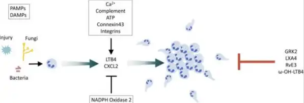 In the figure above, we see that at the start of neutrophil swarming, we begin with either an injury, fungi, or bacteria. As discussed above the PAMPs and the DAMPs trigger the initial neutrophil swarming. Then the LTB4 and CXCL2, which are chemoattractants, that are there to further the signals that cause a cascade of intracellular reactions to the disruptions and foreign substances. These begin a process known as swarm aggregation where the bacterial or other substances begin to all congregate together into one massive "ball" of bacteria, as shown above after the second green arrow. Another part of the image includes the box above the LTB4 and CXCL2, including Calcium, complement, ATP, Connexin 43, and Integrins. These also contribute to the chemoattractants by amplifying their signal and causing the swarm aggregation to run more forwardly. However, below is the NADPH Oxidase 2 or NOX2 is a negative regulator of the chemoattractants that may disrupt the events from proceeding forward. These events previously show how neutrophil swarming begins while the steps ahead are going to explain the ending of this process once the body no longer needs this to occur for its health and well-being, if the bacteria fungi or injury has resolved. The most crucial step in terminating the neutrophil swarming is when GPCR kinase 2 or GRK2 has phosphorylated or desensitized the GPCRs (G-protein coupled receptors). Then the other three, Lipoxin A4, resolving E3, and w-OH-LTB4 assist the GRK2 in stopping this process fully.[12]