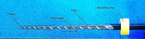 The main components of a nickel titanium rotary file are tip size, taper, flutes, helix angle and measuring stop. There can be other features such as redial lands and measuring lines incorporated in some designs.