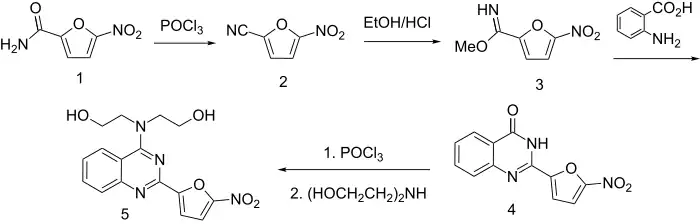 - ↑ Burch HA (May 1966). "Nitrofuryl heterocycles. IV. 4-amino-2-(5-nitro-2-furyl)quinazoline derivatives". Journal of Medicinal Chemistry. 9 (3): 408–10. doi:10.1021/jm00321a034. PMID 5960915.
