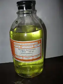 Nitrofurazone (INN, trade name Furacin) is an antimicrobial organic compound belonging to the nitrofuran class.[1] It is most commonly used as a topical antibiotic ointment.[2] It is effective against gram-positive bacteria, gram-negative bacteria, and can be used in the treatment of trypanosomiasis.[1][3][4] Its use in medicine has become less frequent, as safer and more effective products have become available.[5] Nitrofurazone is listed under California Prop 65, and has demonstrated clear evidence to be mutagenic and carcinogenic during animal studies, and has been discontinued for human use in the USA.[2][5][6][7] The substance is pale yellow and crystalline. It was once widely used as an antibiotic for livestock.[8][9]