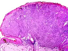 Nodular melanoma (NM) is the most aggressive form of melanoma.[1] It tends to grow more rapidly in thickness (vertically penetrate the skin) than in diameter compared to other melanoma subtypes.[2] Instead of arising from a pre-existing mole, it may appear in a spot where a lesion did not previously exist. Since NM tends to grow in depth more quickly than it does in width, and can occur in a place that did not have a previous lesion, the prognosis is often worse because it takes longer for a person to be aware of the changes. NM is most often darkly pigmented; however, some NM lesions can be light brown, multicolored or even colorless (non-pigmented). A light-colored or non-pigmented NM lesion may escape detection because the appearance is not alarming, however an ulcerated and/or bleeding lesion is common.[3]: 696 Polypoid melanoma is a virulent variant of nodular melanoma.[3]: 696