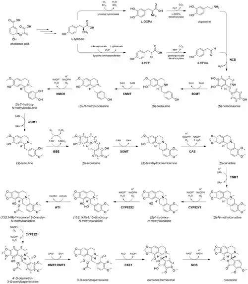 - ↑ Dang TT, Chen X, Facchini PJ (February 2015). "Acetylation serves as a protective group in noscapine biosynthesis in opium poppy". Nature Chemical Biology. 11 (2): 104–106. doi:10.1038/nchembio.1717. PMID 25485687.