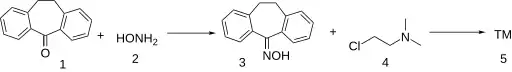 The ketone dibenzosuberenone (1) is treated with hydroxylamine (2) to give its ketoxime (3). Base-catalyzed alkylation with ClCH2CH2N(CH3)2 (4) yields noxiptiline.[10][11][12]